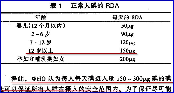 由于我国完全按照世界卫生组织、联合国儿童基金会和国际控制碘缺乏病理事会关于补碘的各项计划,1997年和1999年全国碘营养检测儿童尿碘水平分别达到了330微克/升和306微克/升,为了掩盖补碘过量上述三个国际组织除了把儿童尿碘的足够水平由100改为100—200微克/升之外,同时重申推荐碘摄入量。12岁以上及成年人的每人每天推荐碘摄入量为150微克。