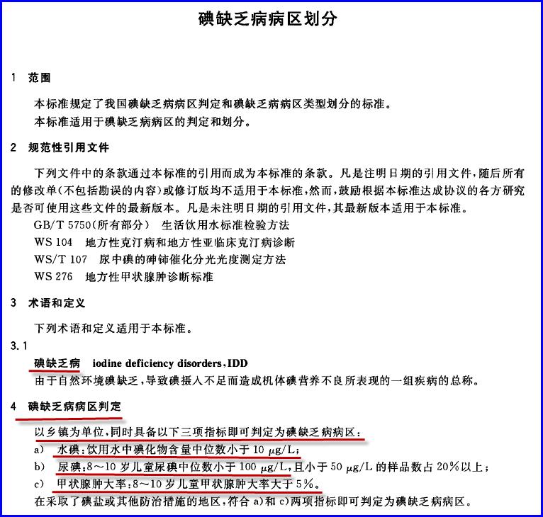 1995年前我国制定的碘缺乏病病区标准是水碘低于5微克/升是确定为缺碘地区的辅助条件。在这个标准下,我国的病区人口大约为总人口的30%左右,这个结果是符合中国国情的,也是符合世界卫生组织和国际控制碘缺乏病理事会的估测的。
