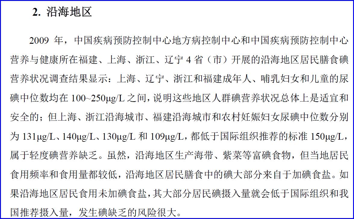 2009年,中国疾病预防控制中心地方病控制中心和中国疾病预防控制中心营养与健康所在福建、上海、浙江、辽宁4省(市)开展的沿海地区居民膳食碘营养状况调查结果显示:上海、辽宁、浙江和福建成年人、哺乳妇女和儿童的尿碘中位数均在100~250μg/L之间,说明这些地区人群碘营养状况总体上是适宜和安全的;但上海、浙江沿海城市、福建沿海城市和农村妊娠妇女尿碘中位数分别为131μg/L、140μg/L、130μg/L和109μg/L,都低于国际组织推荐的标准150μg/L,属于轻度碘营养缺乏。虽然,沿海地区生产海带、紫菜等富碘食物,但当地居民食用频率和食用量都较低,沿海地区居民膳食中的碘大部分来自于加碘食盐。如果沿海地区居民食用未加碘食盐,其大部分居民碘摄入量就会低于国际组织和我国推荐摄入量,发生碘缺乏的风险很大。”