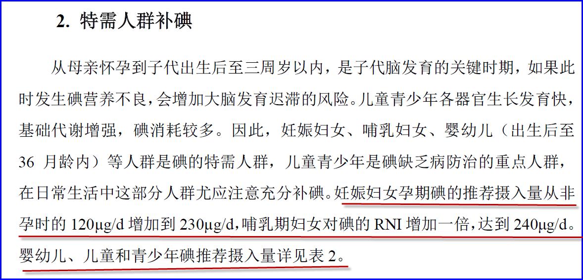 从母亲怀孕到子代出生后至三周岁以内,是子代脑发育的关键时期,如果此时发生碘营养不良,会增加大脑发育迟滞的风险。儿童青少年各器官生长发育快,基础代谢增强,碘消耗较多。因此,妊娠妇女、哺乳妇女、婴幼儿(出生后至36月龄内)等人群是碘的特需人群,儿童青少年是碘缺乏病防治的重点人群,在日常生活中这部分人群尤应注意充分补碘。妊娠妇女孕期碘的推荐摄入量从非孕时的120μg/d增加到230μg/d,哺乳期妇女对碘的RNI增加一倍,达到240μg/d。婴幼儿、儿童和青少年碘推荐摄入量详见表2。”