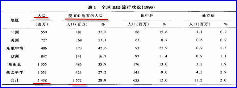 表1 国际控制碘缺乏病理事会1990年碘缺乏病全球流行状况