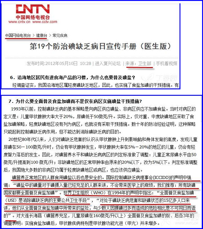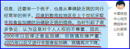 “但是,还要举一个例子,也是从事碘缺乏病的同行经常举的例子。印度的勘克拉地区在上个世纪采取全民食盐加碘防治碘缺乏病的措施。当时引起了很多争论,认为这是对个人人权的不尊重,因此,2000年以后停止食盐加碘,但病情反弹严重,2005年以后又进行全面食盐加碘,病情再次下降”