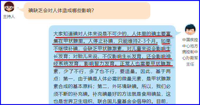 “大家知道碘对人体来说是不可少的,人体里的碘主要富集在甲状腺里。人停止补碘,只能维持2-3个月。如果不继续补碘,会缺乏甲状腺激素,对儿童来说会影响生长发育;对胎儿来说,不仅影响生长发育,还会影响神经系统发育,影响智力发育。”