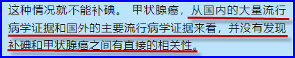 “甲状腺癌,从国内的大量流行病学证据和国外的主要流行病学证据来看,并没有发现补碘和甲状腺癌之间有直接的相关性”。