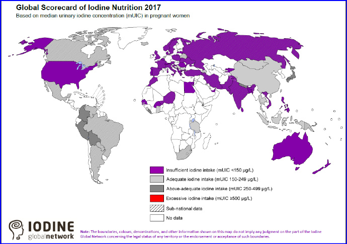 下图是国际控制碘缺乏病网络联盟2017年全世界孕妇碘营养情况状态图,
