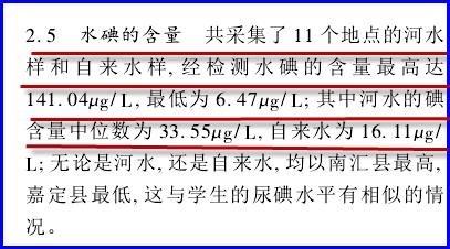 “共采集了11个地点的河水样和自来水样,经检测水碘的含量最高达141.04Lg/L,最低为6.47Lg/L;其中河水的碘含量中位数为33.55Lg/L,自来水为16.11Lg/L;无论是河水,还是自来水,均以南汇县最高,嘉定县最低,这与学生的尿碘水平有相似的情况。”