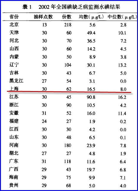 在这个标准里,水碘成为我国碘缺乏病区划分的第一位 。按照这个碘缺乏病评定标准,上海不但是缺碘区,而且水碘是3微克/升,已经是中等严重的碘缺乏病病区了。