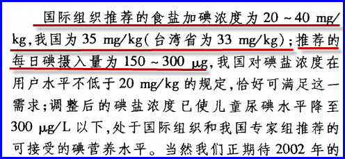 “国际组织推荐的食盐加碘浓度为2 0~4 0 m g/k g ,我国为3 5 mg/k g (台湾省为3 3 m g/k g ) ;推荐的每日碘摄入量为 1 5 0~3 0 0μ g ,我国对碘盐浓度在用户水平不低于2 0 mg/k g的规定 ,恰好可满足这一需求;调整后的碘盐浓度已使儿童尿碘水平降至3 0 0 g/L以下,处于国际组织和我国专家组推荐的可接受的碘营养水平”。