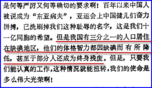 “但是我国有三分之一的人口居住在缺碘地区,他们的体格智力都因缺碘而有所降低,甚至于部分人还成为终身残废。但是,只要我们能认真的工作,这种情况就能扭转,我们的使命是多么伟大光荣啊”