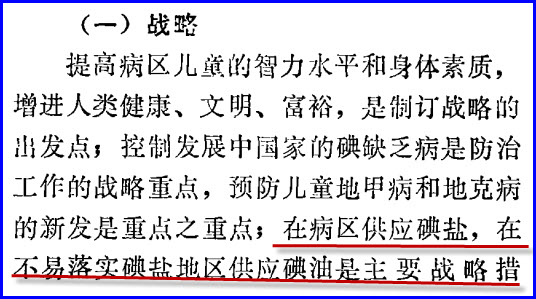 “提高病区儿童的智力水平和身体素质,增进人类健康、文明、富裕,是制订战略的出发点 控制发展中国家的碘缺乏病是防治工作的战略重点,预防儿童地甲病和地克病的新发是重点之重点。在病区供应碘盐,在不易落实碘盐地区供应碘油是主要战略措施,全球在10年基本控制碘缺乏病人类力争实现 的战略目标”