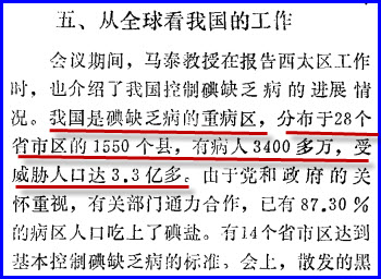 “从全球看我国的工作会议期间,马泰教授在报告西太区工作时,也介绍了我国控制碘缺乏病的进展情况。我国是碘缺乏病的重病区,分布于28个省市区的1550个县,有病人3400万,受威胁人口达3.3亿多。由于党和政府的关怀重视,有关部门通力合作,已有的病区人口吃上了碘盐。有个省市区达到基本控制碘缺乏病的标准”。