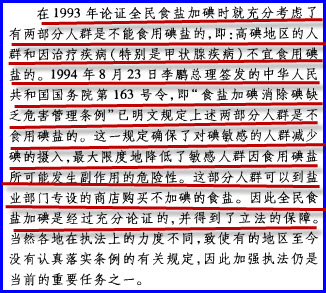 1994年8月23日李鹏总理签发的中华人民共和国国务院第163号令,即 “食 盐加碘消除碘缺乏危害管理条例”已明文规定上述两部分人群是不食用碘盐的。这一规定确保了对碘敏感的人群减少碘的摄入,最大限度地降低了敏感人群因食用碘盐所可能发生副作用的危险性。这部分人群可以到盐业部门专设的商店购 买不加碘的食盐。 因此全民食盐加碘是经过充分论证的,并得到了立法的保障。