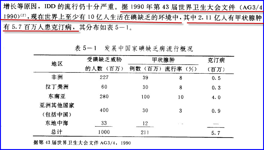 “据1990年第43届世界卫生大会文件(AG3/4 1990)现在世界上至少有10亿以上的人生活在碘缺乏的环境中,其中有2.11亿人有甲状腺肿大,有5.7百万人患克汀病。”