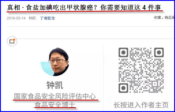 国家食品安全风险评估中心副研究员钟凯博士针对本人发表的《中国把碘化钾补碘改为碘酸钾的终极秘密》的文章,于2016年5月14日发表文章《真相 · 食盐加碘吃出甲状腺癌? 你需要知道这 4 件事》,这篇文章的观点是毒品只要是少量就安全!