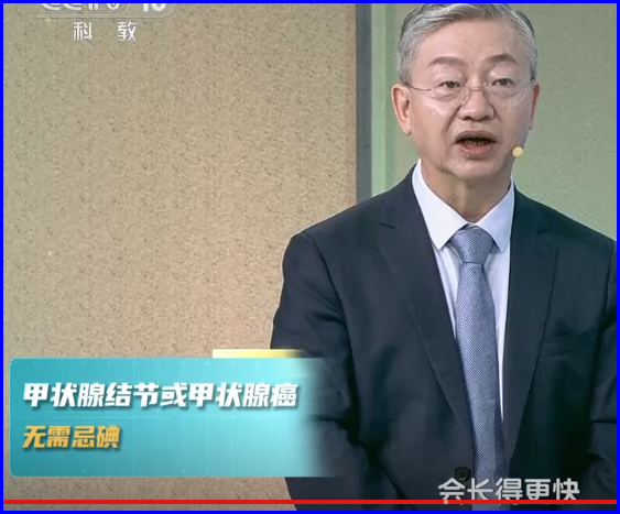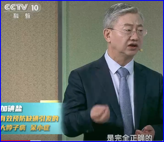 “1978年1979年1980年,那个时候是局部地区补碘,比如说是什么贵州省,云南省局部地区缺的厉害,当地就给他补碘盐,发现有效,然后就大约在1995年开始全国推广,全民食用盐里面都要加碘。到了2005年之后,你几乎再也没见过大脖子病,也没见过呆小症,这就说明加碘盐把这个给预防了。所以我们在这里必须表示,就是中国的这个加碘策略是完全正确的,也是非常成功的。”