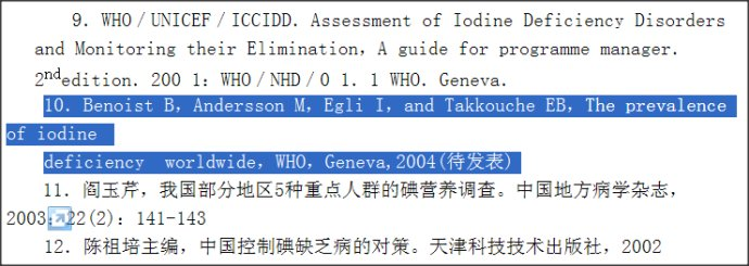 查参考资料“10.Benoist B,Andersson M,Egli I,and Takkouche EB,The prevalence of iodine deficiency worldwide,WHO,Geneva,2004(待发表)”