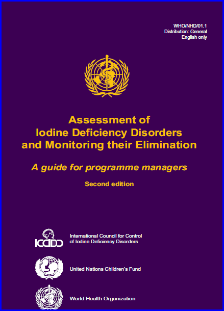 “1999年和2000年WHO/UNICEF/ICCIDD对94年发表的“碘缺乏病和食盐加碘的评估指标”进行了修订后,于2001年发表了它的第二版,书名为“评估碘缺乏病和对其消除的监测 - 项目管理的指导”。该书提出了评估儿童碘营养和尿碘中位数的流行病原则,是以尿碘为基本判定原则。