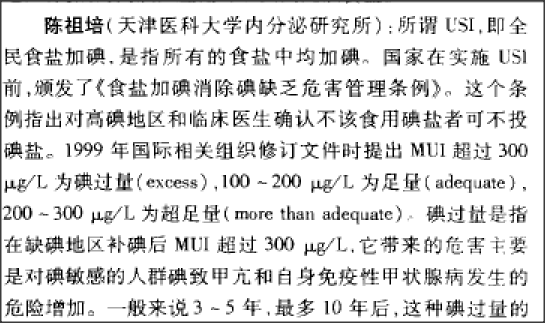 “1999年国际相关组织修订文件时提出MUI超过300μg/L为碘过量(exeess),100~200 gμg/L为足量(adequate),200~300 μg/L为超足量(more than adequate)”,