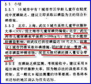 卫生部为全民补碘制造依据,于1994年对全国10大城市市区学龄儿童碘营养状况进行了调查,调查报告的执笔人阎玉芹说:“北京、武汉两市儿童尿碘水平虽然>100µ g/L.但北京不能排除碘盐影响,而武汉已供应碘盐达l8月之久”,但是这个理由的提出却没有任何证据支持。而且前后矛盾,语无伦次,具体如下: