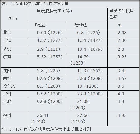 “本项目在中国医学基金会智力工程委员会的资助下,在1994年对10大城市市区学龄儿童碘营养状况进行了调查,本次调查以B超法甲状腺肿大率为主要指标.尿碘水平为重要参考指标,因为本次尿碘可能受碘盐干扰),根据国际推荐[1]及国家标准[2]进行评价。