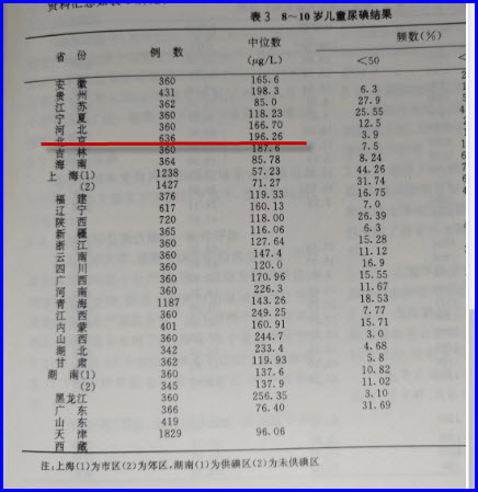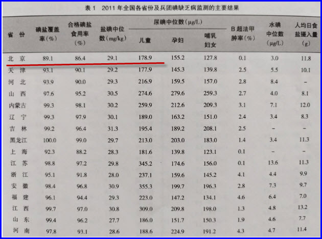 但是北京经过15年的大剂量强制全民碘酸钾过量补碘后的2011年,北京儿童尿碘是178.9 µg/L,比1995年低了低了17.36µg/L。