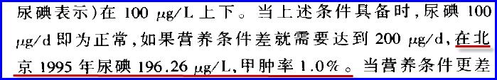1995年北京儿童尿碘是196.26微克/升,达到尿碘这个程度的碘摄入量最少也是260微克/天。