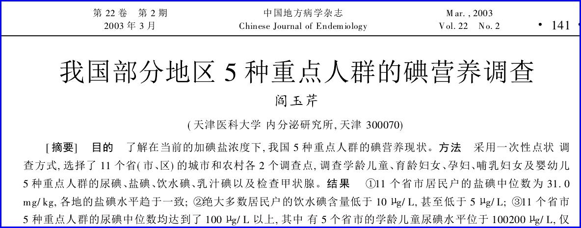 【论文题目】《我国部分地区5种重点人群的碘营养调查》