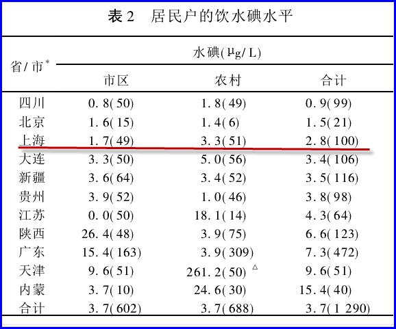 在这个标准里,水碘成为我国碘缺乏病区划分的第一位 。按照这个碘缺乏病评定标准,上海不但是缺碘区,而且水碘是3微克/升,已经是中等严重的碘缺乏病病区了。