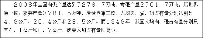 中国解放65年来,全世界公认中国人民的生活水平极大的提高了,特别是改革开放30年来,中国人的生活水平迅速提高。肉、蛋、奶的消耗量是衡量人群生活水平的主要指标,中国人解放65年来肉蛋奶消耗量增加12~20多倍。
