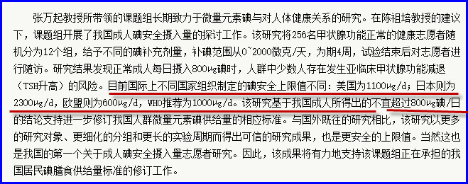 张万起等的论文罗列了国外的最大碘摄入量“美国为1100µg/d;日本则为2300µg/d,欧盟则为600µg/d,WHO推荐为1000µg/d”,是什么目的呢?很明显是告诉中国人中国的最大碘摄入量是安全的,可靠的,有国际样板证明的。但是美国、欧盟、WHO全部是指用碘化钾补碘时的标准,全世界到现在也根本就没有碘酸钾补碘时最大碘摄入量的标准。