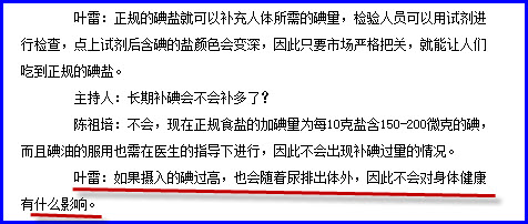 陈祖培:食盐加碘不是始于中国,最早始于瑞士、美国,从192几年开始,到现在快100年了,人家大量病例调查结果,跟碘是没有关系。因为你补充的是生理剂量,并没有大。