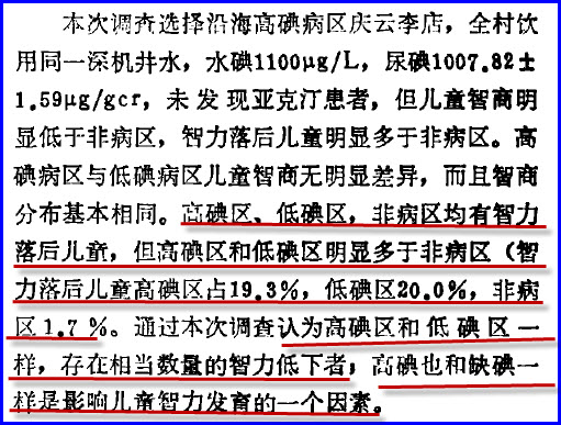 上述事实证明补碘过量确确实实可以引起智力下降,我国如果继续强制全民补碘的话,再过二三十年,中国也会进入变笨的行列,而且变笨的速度要比西方更快。