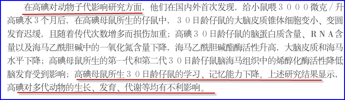 对食源性和水源性高碘地区小学生进行智力测试,发现高碘区儿童平均智商明显低于对照区,且有统计学差异。动物实验研究,在仔鼠脑发育临界期,过量碘的摄入可使脑内乙酰胆碱酯酶活性升高,使脑内胆碱能系统受到影响,导致学习、记忆能力障碍。高碘可以诱发豚鼠大脑皮质、海马和甲状腺细胞凋亡,呈现凋亡形态学及生物特征性改变,造成对甲状腺及中枢神经系统损伤,进而影响其功能活动性。