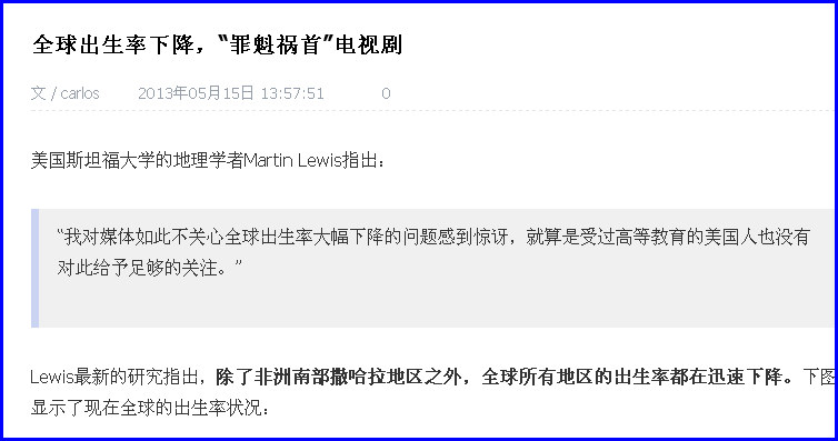 美国斯坦福大学的地理学者Martin Lewis把全球出生率下降的原因归于看电视剧是明显错误的。因为现代人有很多人不看电视剧,出生率仍然不高。