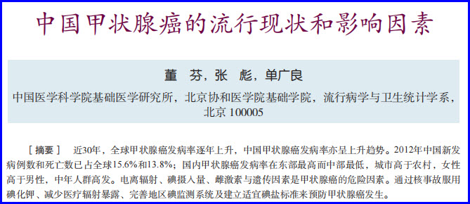 【编者按】当前甲状腺癌发病率上升是不争的事实,原因很多,把甲状腺癌发病率上升完全归结于补碘过量是错误的,不公平的,但是完全认为补碘过量不会引起甲状腺癌上升也是错误的。