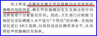 结论碘超足量和碘过量可以诱发和促进甲减和自身免疫甲状腺炎的发生和发展,所以尿碘中位数大于200μg/L是不安全的。尿碘中位数持续为600μg/L的高碘地区的甲状腺癌高发现象值得进一步深入研究。