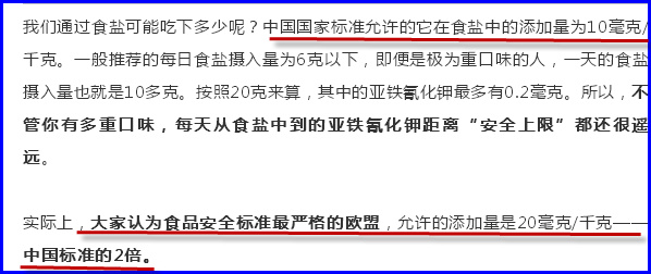 附录中钟凯的文章里,全部都是食盐里添加亚铁氰化钾10毫克/公斤,能不说是欺上瞒下吗?