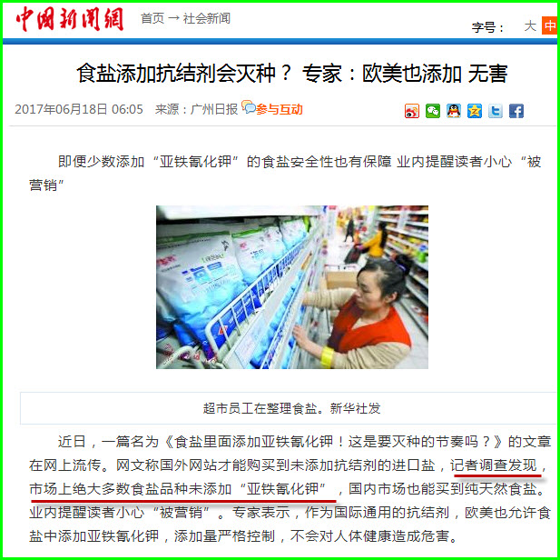 为了配合国家卫健委关于食盐中添加亚铁氰化钾的宣传,国内很多媒体大加配合。例如中国新闻网2017年6月18日发表的文章。