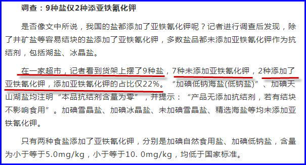 “记者调查发现,市场上绝大多数食盐品种未添加“亚铁氰化钾”,在一家超市,记者看到货架上摆了9种盐,7种未添加亚铁氰化钾,2种添加了亚铁氰化钾,添加亚铁氰化钾的占比仅22%”。