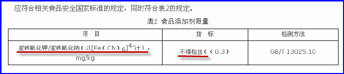 该文件仍然要求碘盐的比例不低于90%,而碘盐含有亚铁氰化钾的比例在90%以上,因此即使到现在,食盐含有亚铁氰化钾的比例至少80%。