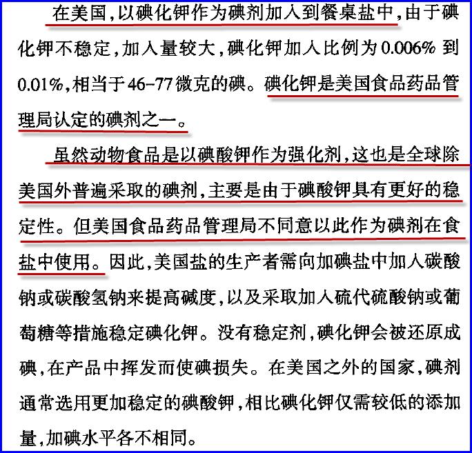 虽然动物食品是以碘酸钾作为强化剂,这也是全球除美国外普遍采取的碘剂,主要是由于碘酸钾具有更好的稳定性。但美国食品药品管理局不同意以此作为碘剂在食用盐中使用。