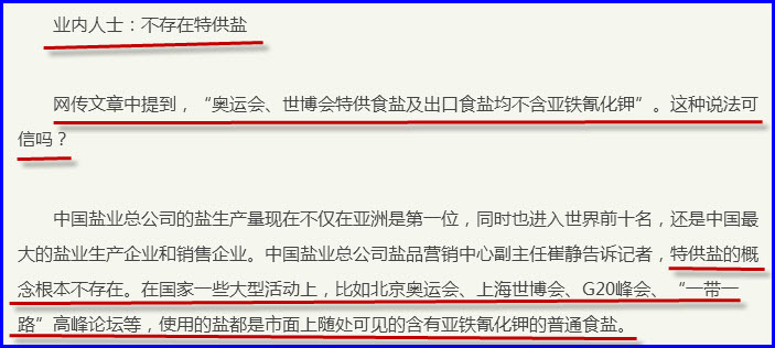 “网传文章中提到,“奥运会、世博会特供食盐及出口食盐均不含亚铁氰化钾”。这种说法可信吗?