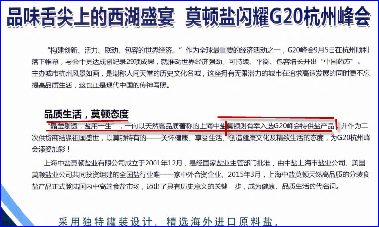 "晶莹剔透,盐用一生〃 ,一向以天然高品质著称的上海中盐莫顿则有幸入选G2 0峰会特供盐产品,并作为二次供货商结缘袓国盛世,以莫顿特 有的关怀健康、享受生活、创造健康文化及精致生活的态度,为G20杭州峰会添姿加彩!