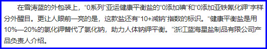 在雪涛蓝的外包装上,“0系列”亚运健康平衡盐的“0添加碘”和“0添加亚铁氰化钾”字样分外醒目。更让人眼前一亮的是,这款盐还有“10+减钠”指数的标识。