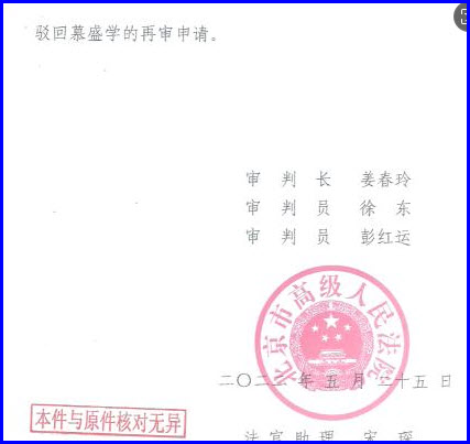 由于本案的一审和二审全部为国家卫健委的谎言辩护,本人不得不向最高法院提出申诉,但最高法院告诉我向原审法院提出。于是北京高级人民法院启动了再审程序。再审行政裁定书驳回我的再审请求。但是里面根本不提证据2的存在,完完全全相信国家卫健委的谎言,继续为谎言辩护。