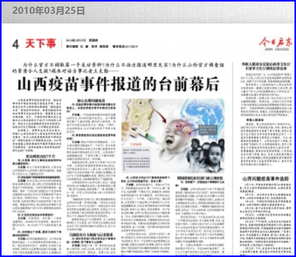 2010年3月17日,历时半年多调查,发表《山西疫苗乱象调查》,引发巨大震荡。此后全国疫苗普查及安全警示制度得以实施。