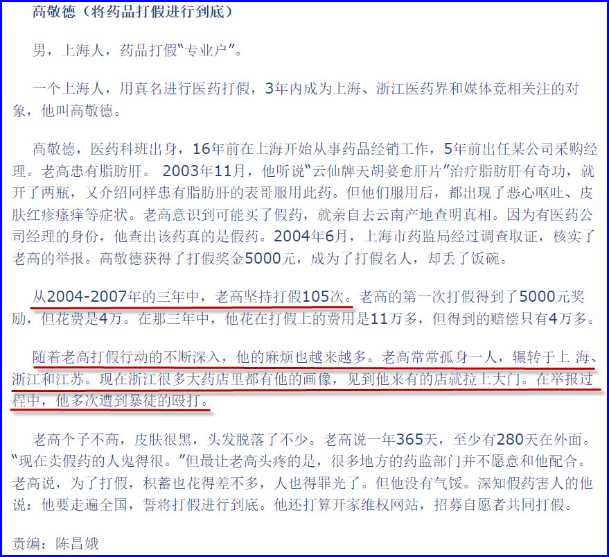 高敬德,从2004-2007年的三年中坚持医药打假105次,被上海、浙江医药界和媒体竞相关注。
