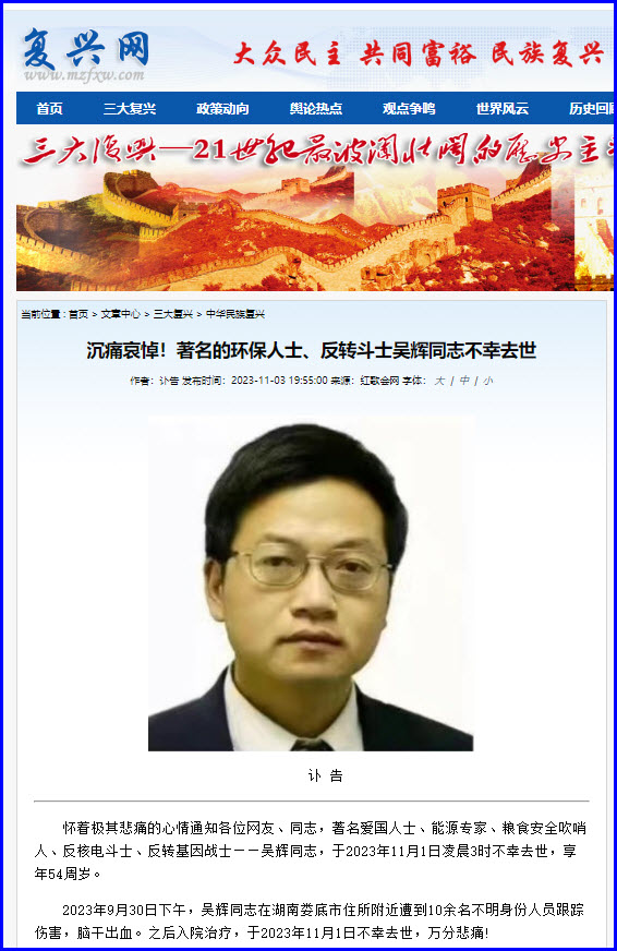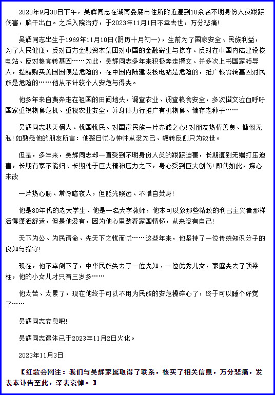 2023年9月30日下午,吴辉同志在湖南娄底市住所附近遭到10余名不明身份人员跟踪伤害,脑干出血。之后入院治疗,于2023年11月1日不幸去世,万分悲痛!