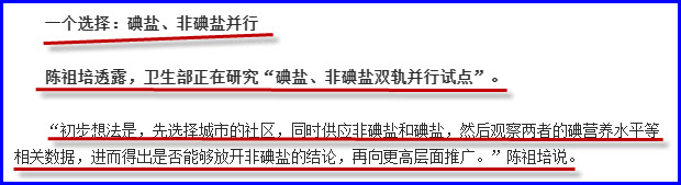 陈祖培透露,卫生部正在研究“碘盐、非碘盐双轨并行试点”。