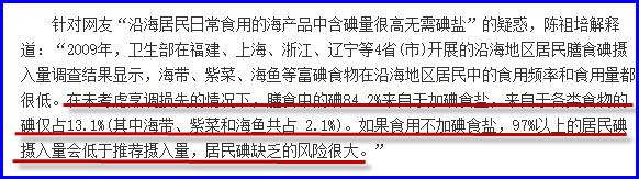 针对网友“沿海居民日常食用的海产品中含碘量很高无需碘盐”的疑惑,陈祖培解释道:“2009年,卫生部在福建、上海、浙江、辽宁等4省(市)开展的沿海地区居民膳食碘摄入量调查结果显示,海带、紫菜、海鱼等富碘食物在沿海地区居民中的食用频率和食用量都很低。在未考虑烹调损失的情况下,膳食中的碘84.2%来自于加碘食盐,来自于各类食物的碘仅占13.1%(其中海带、紫菜和海鱼共占 2.1%)。如果食用不加碘食盐,97%以上的居民碘摄入量会低于推荐摄入量,居民碘缺乏的风险很大。”